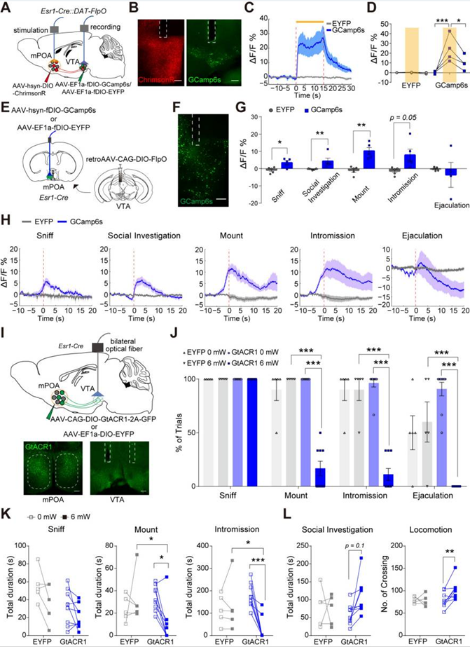 接下来,许晓鸿博士对生殖行为的神经环路调控研究进行了介绍。在诸多本能行为中,生殖行为对个体生存及物种延续均有着重要的意义。长久以来,下丘脑的视前区(POA)被认为是雄性生殖行为的重要调控中枢,对其的激活或抑制可以促进或干扰雄性的交配行为。许晓鸿博士团队的相关研究发现,激活POAEsr1神经元亚群向腹侧被盖区(VTA)的投射可激活该处的多巴胺能(DA)神经元并促进交配的启动,而抑制这一投射可阻碍交配的进行,却不抑制雌雄鼠间的社交探索。这些结果提示了VTADA神经元以及下丘脑到VTA的投射在将动机状态转换为具体行为中的重要作用。