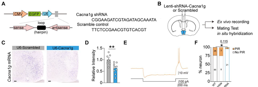 以往的研究发现,POA的上游终纹床核(BNST)向POA的投射对交配的发起是必要的,而这一投射却多为抑制性输入,似乎与激活POA促进交配发起的现象并不一致。这一现象引起了许晓鸿博士团队及其合作伙伴的兴趣,他们通过电生理技术发现,POA区域几乎没有局部的中间神经元,因此BNST抑制中间神经元,进而对POA交配相关神经元产生去抑制作用的可能性较小。通过对爬跨激活的神经元活动的分析,研究团队发现在行为起始前,这群神经元活动受到了抑制,在行为开始后激活,呈现出post-inhibitory rebound firing (PIR)的现象。对POA神经元的计算建模显示,T型钙离子电流(IT)对PIR的形成是至关重要的。作者们通过操控POA神经元中编码T型钙离子通道的Cacna1g分子,发现其敲低可干扰PIR的形成并抑制交配行为,其过表达可以促进雄性交配行为发生。综合以上结果,许晓鸿博士提出,交配行为的调节就像一台发动机的引擎,由PA而来的刺激、BNST的抑制性输入及POA的T型钙离子电流共同完成运作,引导行为发生。