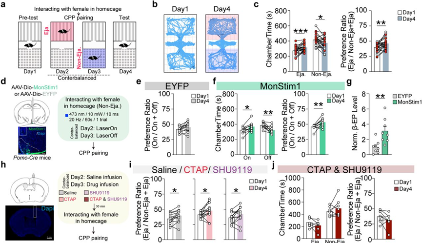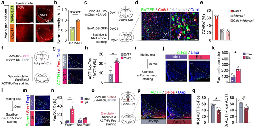在对交配行为起始的调节机制进行介绍后,许晓鸿博士又为听众介绍了交配过程的终点——射精行为触发情感状态的内在神经环路机制研究。研究团队通过Act-seq测序发现,POA区域的Calb1神经元被射精选择性激活,后续的钙信号记录也显示,Calb1+神经元在射精时被选择性激活,而Calb1-神经元则未见信号上升。光遗传学抑制Calb1+神经元可延长交配时程,使射精时间延后。在此基础上,许晓鸿博士团队对该神经元亚群的下游进行了追踪,发现与Calb1-神经元相比,Calb1+神经元有更多的弓状核(Arc)及腹内侧下丘脑的投射。示踪实验及染色实验显示,Arc的Pomc神经元接收上游POACalb1神经元的投射,并被射精特异性激活。钙信号记录显示,射精后Pomc神经元呈现了持续性的激活;而ELISA实验显示,射精后雄性小鼠脑脊液中的β内啡肽(可由Pomc神经元释放)水平明显升高,提示了Pomc神经元在射精后欣快情绪状态中的作用。后续的光遗传学实验显示,Pomc神经元的激活可提高小鼠对关联室的位置偏好,而抑制这群神经元可取消射精关联的位置偏好,以上结果综合说明Pomc神经元对射精的内在情绪状态调控是至关重要的。