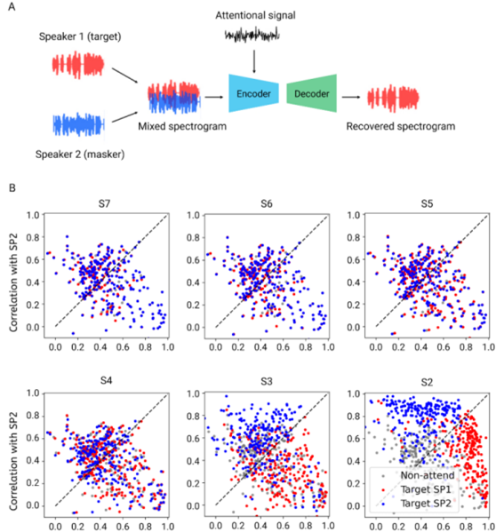 图:(A) 深度神经网络的训练任务示意。(B)注意力投射到深度神经网络的不同层(从上到下分别记为S7-S2)得到的语音分离结果。红色和蓝色的点分的越开表示分离结果越好。