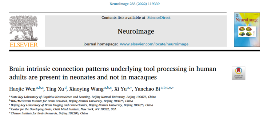 2022年5月29日,北京师范大学毕彦超教授团队和郁曦助理教授团队合作在NeuroImage杂志上发表了题为“Brain intrinsic connection patterns underlying tool processing in human adults are present in neonates and not in macaques”的研究论文,通过对比成年人类、猕猴和人类新生儿,解析了成年人类的工具类客体神经网络演化和个体发育情况。