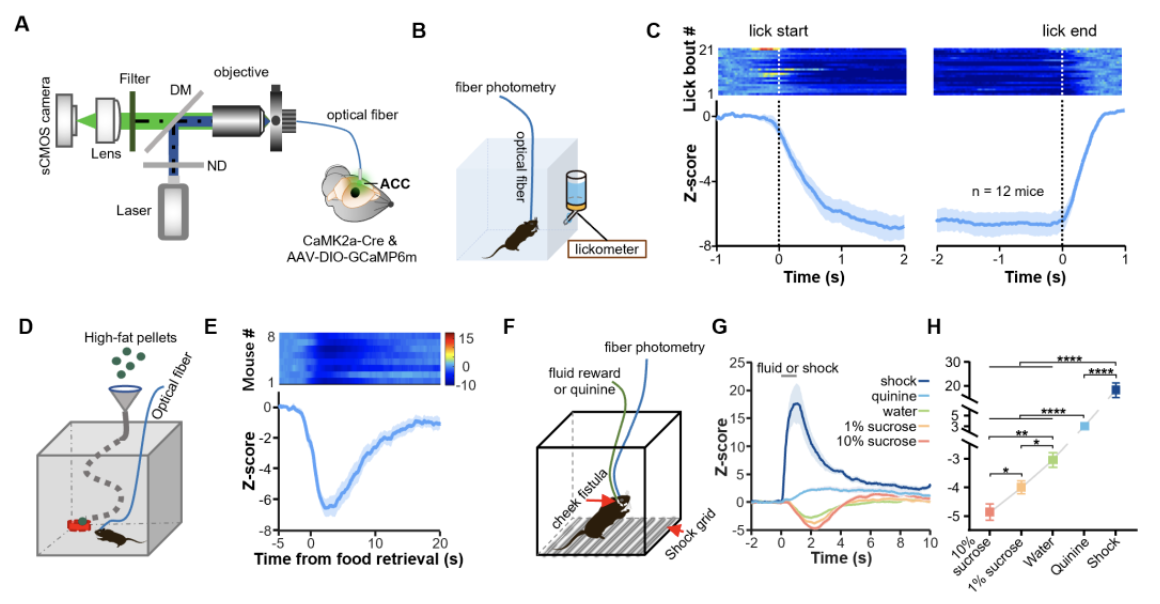 研究团队首先通过光纤记录和小显微镜成像的方式从群体水平和单细胞水平记录了前扣带回锥体神经元对于不同奖赏和惩罚的反应(图1)。无论小鼠是主动摄取奖赏(渴的小鼠舔水瓶,或饿的小鼠吃高脂食物)或是被动接收到从口腔埋管递送的液体奖赏,前扣带回锥体神经元都能被显著地抑制,且该抑制强度与奖赏价值正相关;相反,不同的惩罚性刺激(苦水、电击)则会激活这些神经元。小显微镜成像的结果显示前扣带回锥体神经元中41%被奖赏抑制,21%被奖赏激活,其余无显著反应,整体上也显示出对奖赏是抑制的反应。
