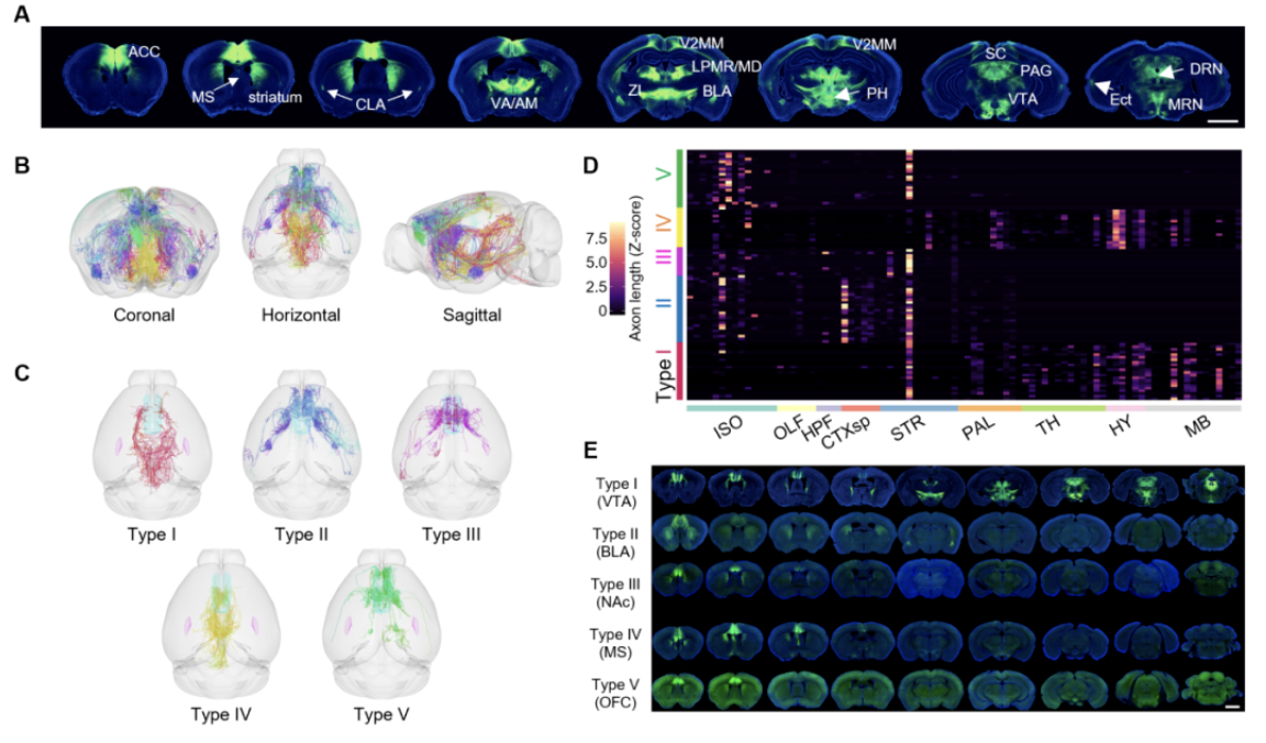 前扣带回神经元在全脑的投射非常复杂,为了探究哪些前扣带回神经元通路编码并控制奖赏贬值、奖赏摄入及抑郁样行为,研究者们通过重构单个神经元的完整形态,鉴定出5类投射特异的前扣带回神经元,分别是投射到VTA、BLA、NAc、MS及OFC的神经元亚群(图5)。进一步的多种示踪实验也确认这五类神经元有不同的侧枝(collateral)模式,胞体位置也各具有特异的分布。