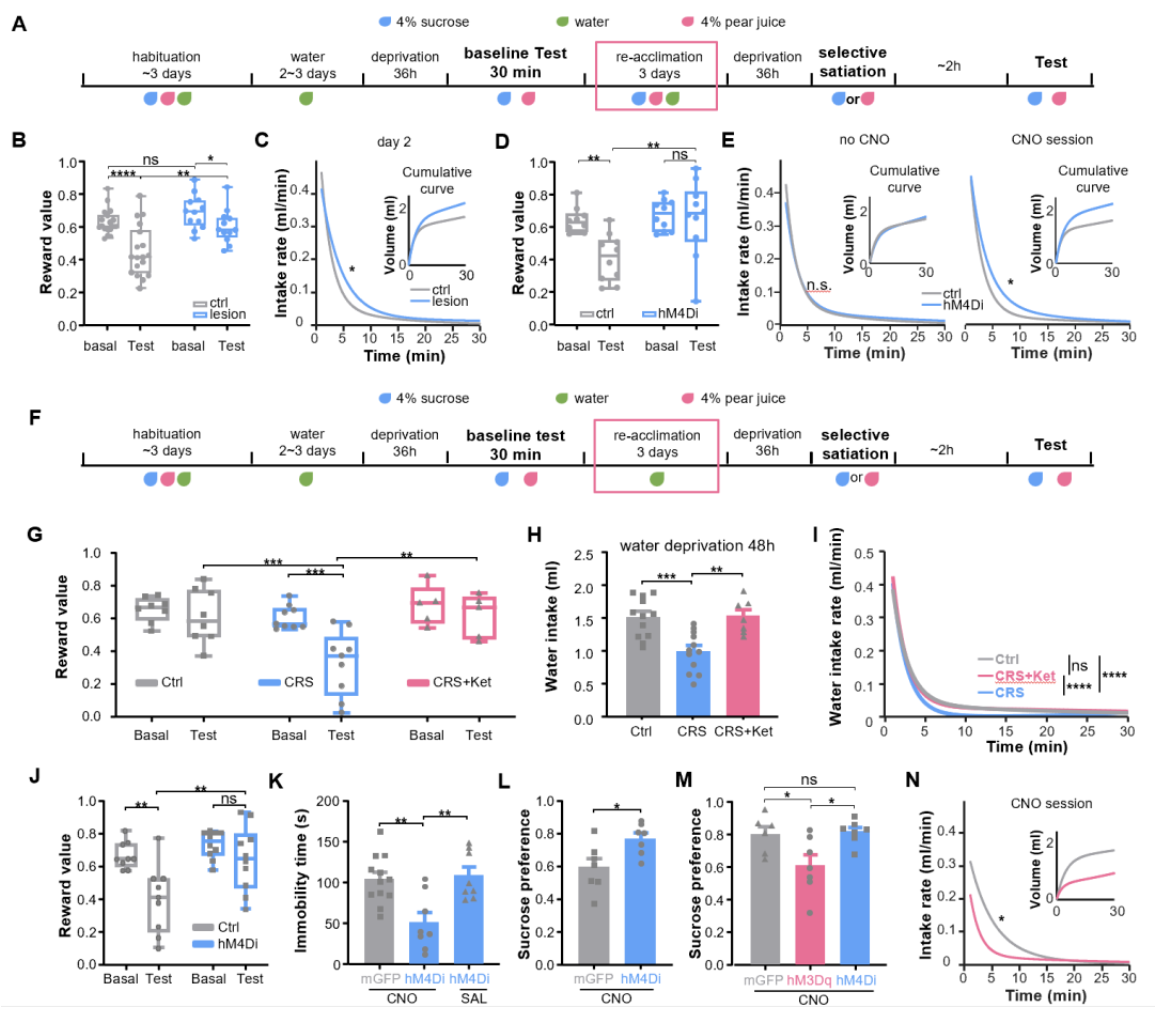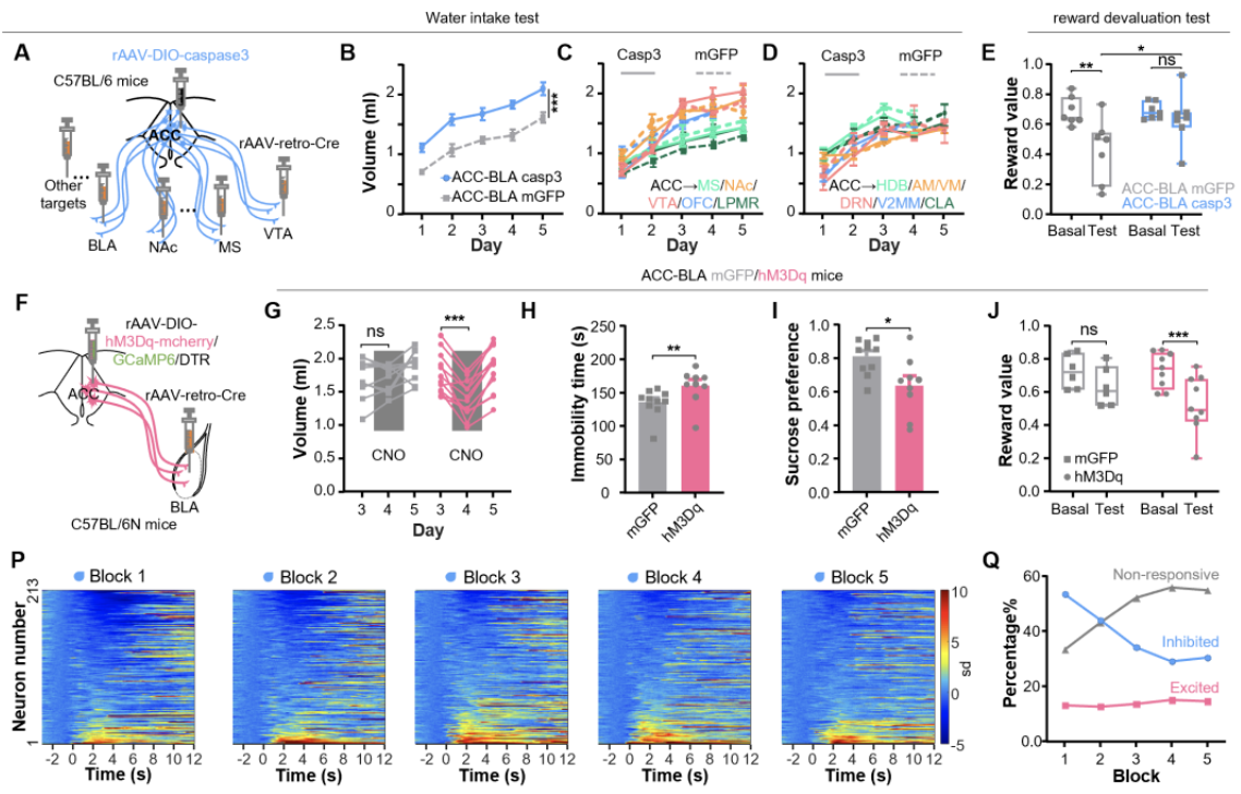 从包括以上提到的5个代表性脑区在内的11个下游脑区分别逆行标记前扣带回神经元,损毁后进行水奖赏摄入测试。只有损毁投射到基底外侧杏仁核(BLA)的前扣带回神经元显著增加了奖赏的摄入,而且显著阻断了奖赏贬值。光纤记录和小显微镜成像也验证了该亚群神经元能够通过逐渐减弱的抑制信号来编码奖赏贬值。激活该类神经元可敏化奖赏贬值、降低奖赏摄入、诱发抑郁样行为;而在抑郁动物中损毁该类神经元则可缓解抑郁样症状。