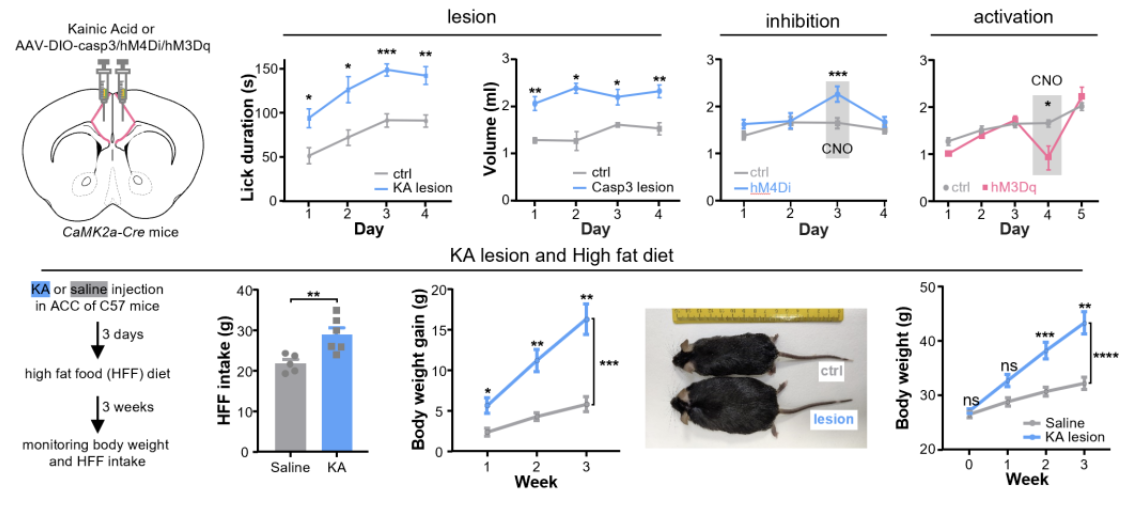 图2. ACC锥体神经元双向调控奖赏摄入,损毁后更易导致肥胖