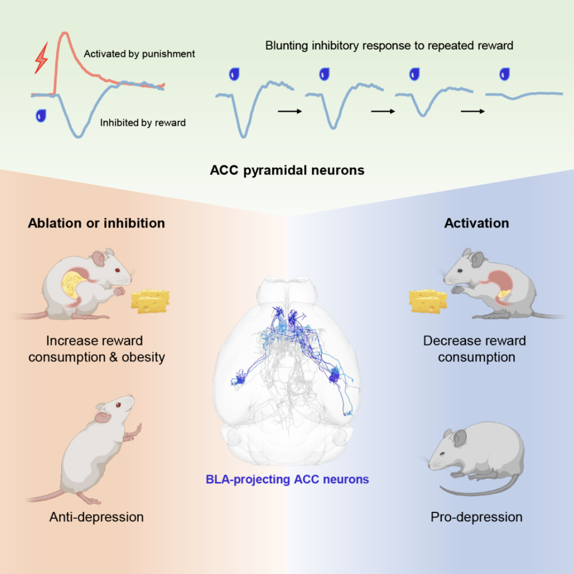 2023年9月20日,北京脑科学与类脑研究所罗敏敏实验室在Neuron发表题为"A Corticoamygdalar Pathway Controls Reward Devaluation and Depression Using Dynamic Inhibition Code"的研究长文,揭示了前扣带回皮层(ACC)的锥体神经元,尤其是其中一类投射到基底外侧杏仁核(BLA)的前扣带回神经元能够编码和调控奖赏贬值。人为操控这些神经元可以相应调控小鼠对奖赏贬值的敏感性,从而使小鼠摄入过多或过少的奖赏,进而发展为肥胖或抑郁样状态。相反的操控方式则可被用来尝试治疗抑郁症等相关疾病。