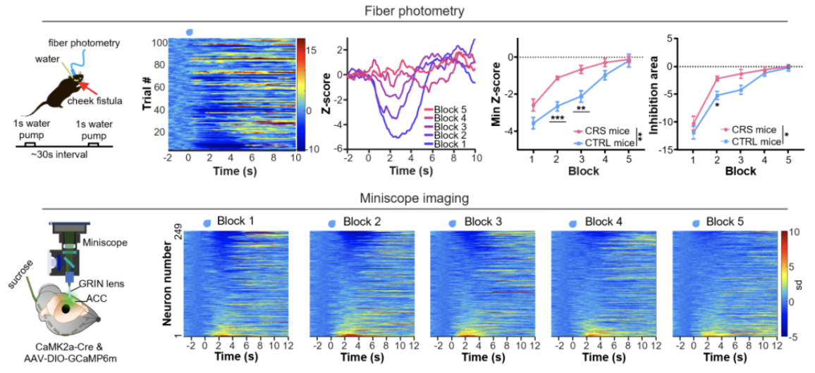 将100次实验平均分为5个block来进行统计分析,可观察到明显的奖赏引起抑制的减弱。同时,抑郁模型小鼠(CRS小鼠)表现出更快速的减弱,暗示抑郁小鼠的奖赏贬值更快。小显微镜成像记录揭示出在单细胞水平,随着奖赏的重复递送,前扣带回神经元中被奖赏抑制的神经元数量逐渐减少,而被奖赏激活的神经元数量无显著变化。
