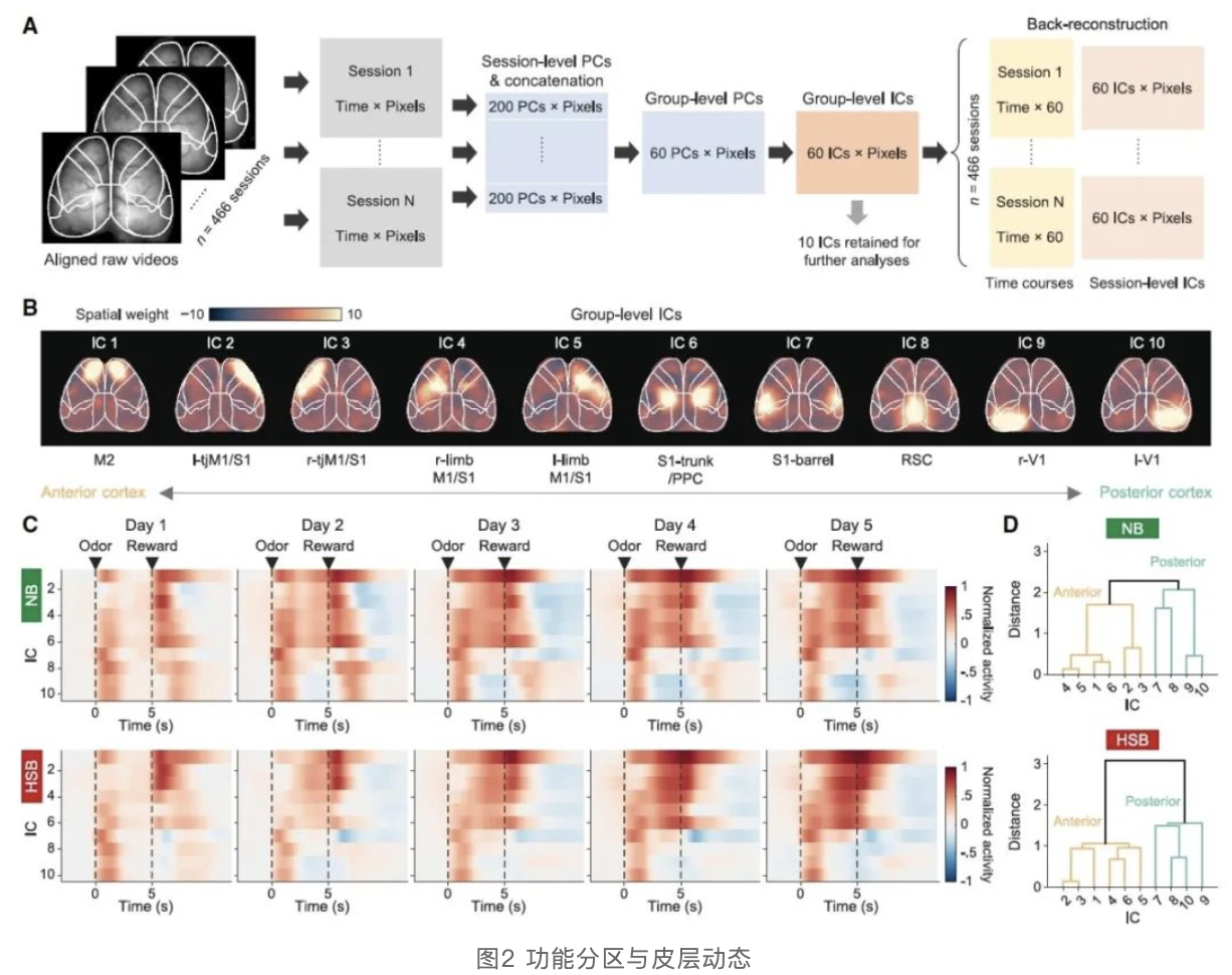原始钙成像数据显示,两组动物的背侧皮层在奖赏刺激和学习过程中均表现出广泛的钙活动,但在多个皮层区域表现出显著差异。由于宽场成像信号具有空间扩散性,单像素信号可能受到相邻区域的干扰;此外,传统的解剖分区难以准确对应功能,不同动物之间的皮层功能定位差异也限制了个体间的比较分析。为精确解析皮层功能的空间特征并进行组间比较,研究团队构建了一个基于群体独立成分分析的功能分区模型,识别出10个在所有动物中共享的空间独立成分,从而实现背侧皮层区域的统一划分,涵盖初级和次级运动皮层、体感皮层、压后皮层和视觉皮层等区域。基于这些一致的功能分区,可以提取个体在对应功能脑区的钙信号时间序列,用于比较学习相关活动、前后皮层功能连接等变化。因此,该方法不仅提升了信号分离的准确性,也确保了数据在个体之间的可比性。