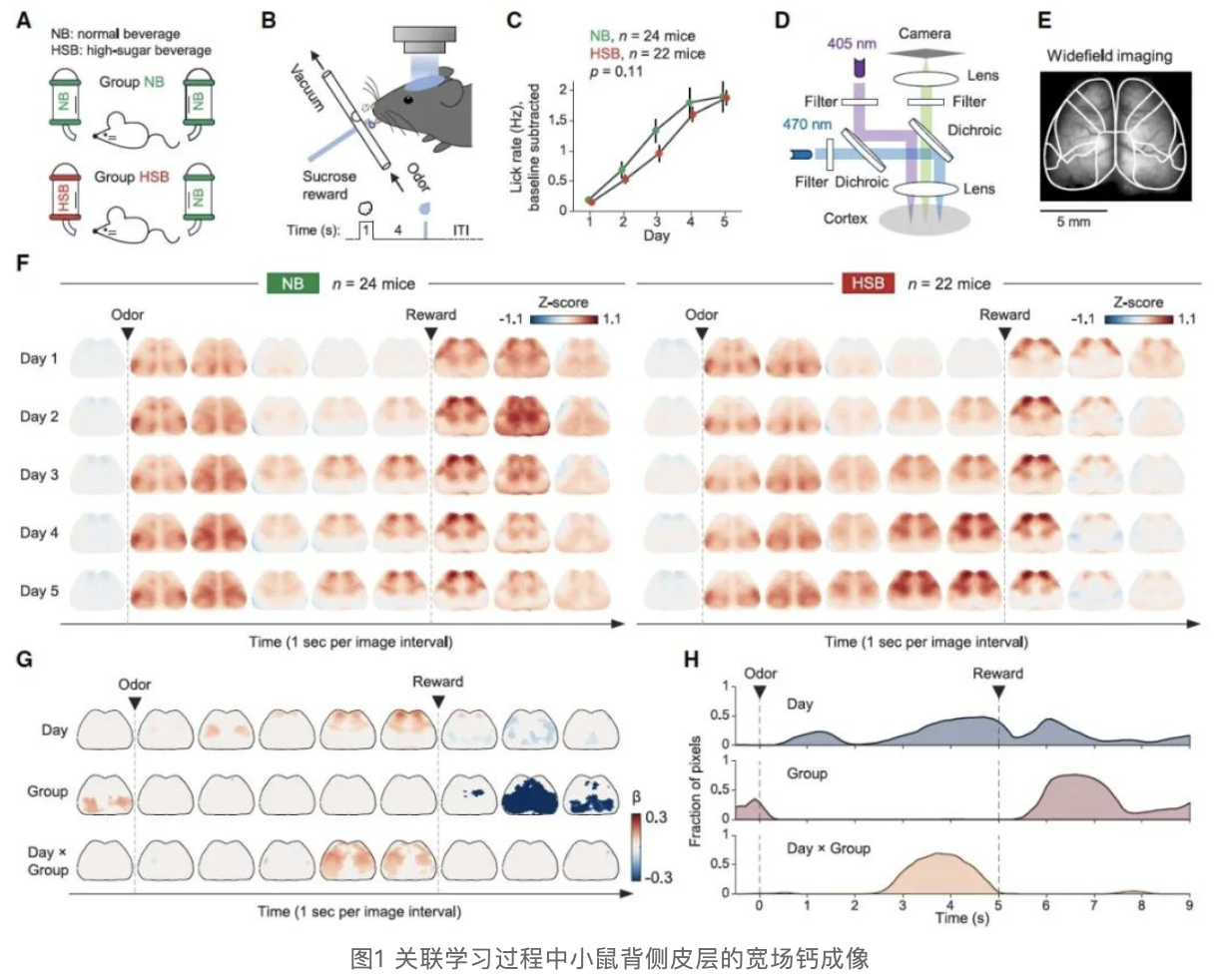 为了探讨蔗糖过量摄入对非奖赏系统的潜在影响,本研究聚焦大脑背侧皮层这一经典奖赏通路以外的区域。背侧皮层在感觉整合、预测处理和运动学习中发挥重要作用,因而为评估高糖饮食对广泛脑功能的影响提供了独特视角。具体实验中,研究团队从离乳期开始建立两组小鼠模型:一组饮用普通水(normal beverage, NB),另一组饮用10%蔗糖溶液(high-sugar beverage, HSB)。在成年期,利用宽场荧光钙成像记录小鼠在气味–蔗糖关联任务中的背侧皮层神经活动,以评估学习过程中的皮层动态变化。