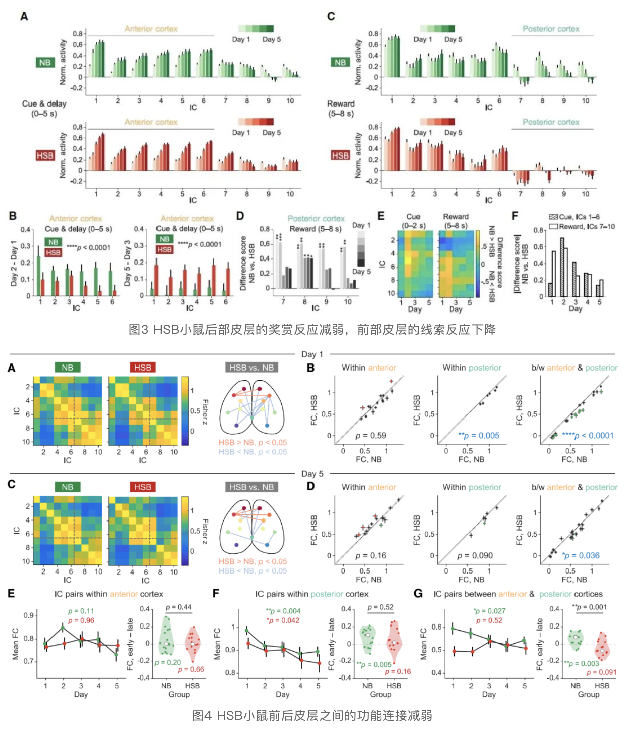 分析结果表明,HSB小鼠在学习过程中表现出明显的皮层功能异常,包括糖水奖赏诱导的后部皮层反应减弱,以及前后皮层功能连接的下降。NB小鼠在前皮层较早建立起稳定的学习相关活动模式,而HSB小鼠则出现明显滞后,神经活动的稳定性和一致性也较差。在任务规则突变(奖赏概率改变)测试中,HSB小鼠展现出更高的行为敏感性,能够更快调整行为应对奖赏概率的改变。成像数据进一步表明,这种灵活性提升伴随着前皮层在奖赏缺失情境下的过度激活,提示这些动物可能对负向预测误差有增强的神经响应,从而驱动其行为上的快速调整。验证实验显示,使用非蔗糖奖赏(牛奶)作为行为训练的强化物,HSB小鼠的行为模式具有相似的变化。
