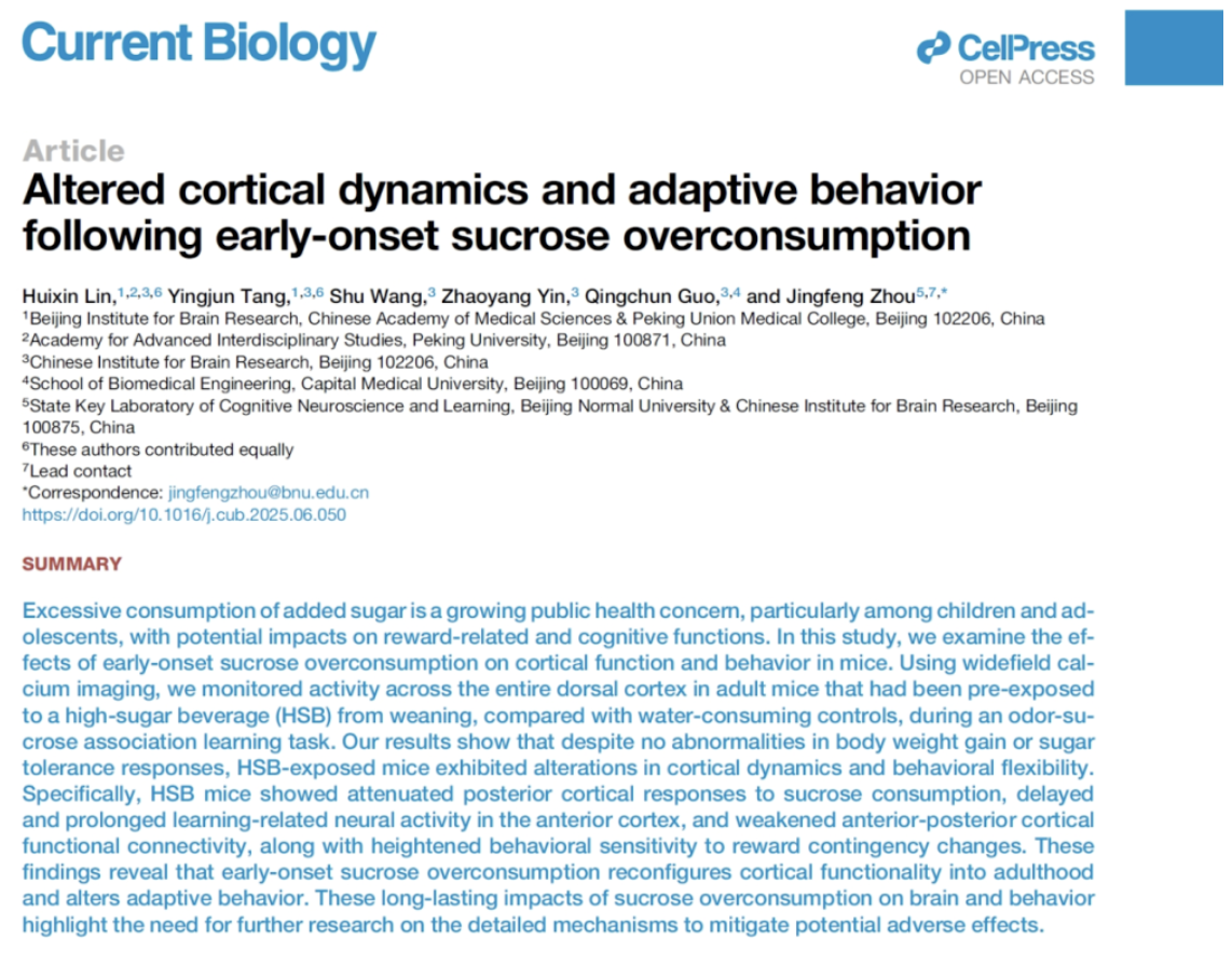 2025年7月14日,北京脑科学与类脑研究所和北京师范大学认知神经科学与学习国家重点实验室周景峰课题组在Current Biology在线发表题为“Altered cortical dynamics and adaptive behavior following early-onset sucrose overconsumption”的研究论文。研究发现,幼年小鼠过量摄入蔗糖会影响成年期大脑皮层的奖赏响应、学习相关活动和功能连接,并改变行为适应性和反馈调节策略。