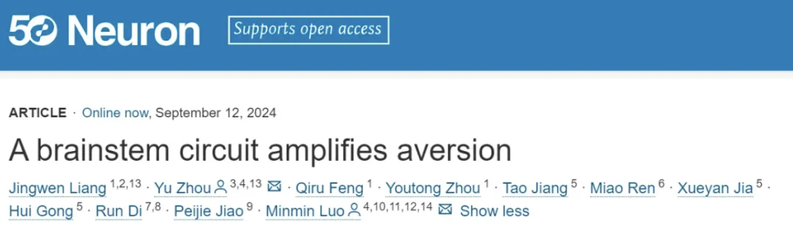 2024年9月12日,北京脑科学与类脑研究所罗敏敏团队在Neuron上发表题为A brainstem circuit amplifies aversion的研究论文。该研究被Nature杂志遴选为“研究亮点”(Research Highlights)。该研究表明,位于脑干的脚间核(Interpeduncular nucleus,IPN)-未定核(Nucleus incertus, NI)环路是大脑中对厌恶反应的放大器(Amplifier),这一发现为情感障碍治疗及阿片类药物复吸预防提供了新的理论基础和潜在的治疗靶点。