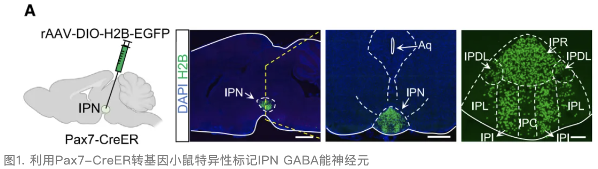 IPN是位于中脑腹侧的一个卵圆形核团,被认为是将前脑和中脑信息传递到后脑的一个重要中继站,其主要神经元类型为抑制性GABA能神经元。研究人员以Pax7-CreER转基因小鼠作为主要的研究对象,利用Cre-Loxp系统和腺相关病毒载体(AAV),特异而充分地标记了IPN的GABA能神经元(图1)。