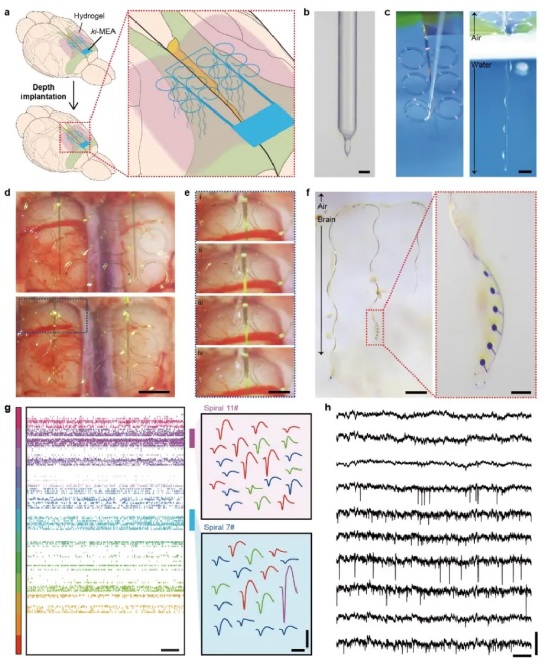 ki-MEAs的植入过程依托刚性针实现构型转变:电极丝从脑表的平面二维结构开始,随着植入深度变化被逐步拉伸,最终在靶点脑区重构为稳定的三维螺旋结构;待植入针抽离,电极丝稳定驻留脑内(图3)。为最大程度降低植入损伤,研究团队创新性地引入具有生物相容性的海藻酸钙水凝胶,构建兼具脑表保护与电极支撑功能的复合界面层。该水凝胶层富含水分,既可隔绝干燥空气以维持表层神经元的生理活性,又能替代脑实质承载电极丝在植入过程中产生的横向切割力,从而显著减少组织损伤,大幅提升了电极的生物相容性。