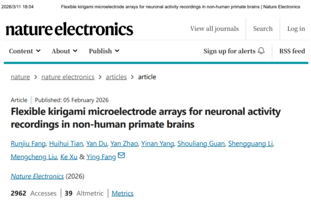 2026年2月5日,北京脑科学与类脑研究所方英课题组传来重磅消息——其突破性成果"Flexible kirigami microelectrode arrays for neuronal activity recordings in nonhuman primate brains"在Nature Electronic 在线发表。该工作创新性提出了一种基于剪纸设计的柔性微电极阵列,成功破解了灵长类大脑高通量,大规模,长期稳定神经记录的核心难题,为非人灵长类动物的神经科学研究和脑机接口转化迈出了关键的一步。