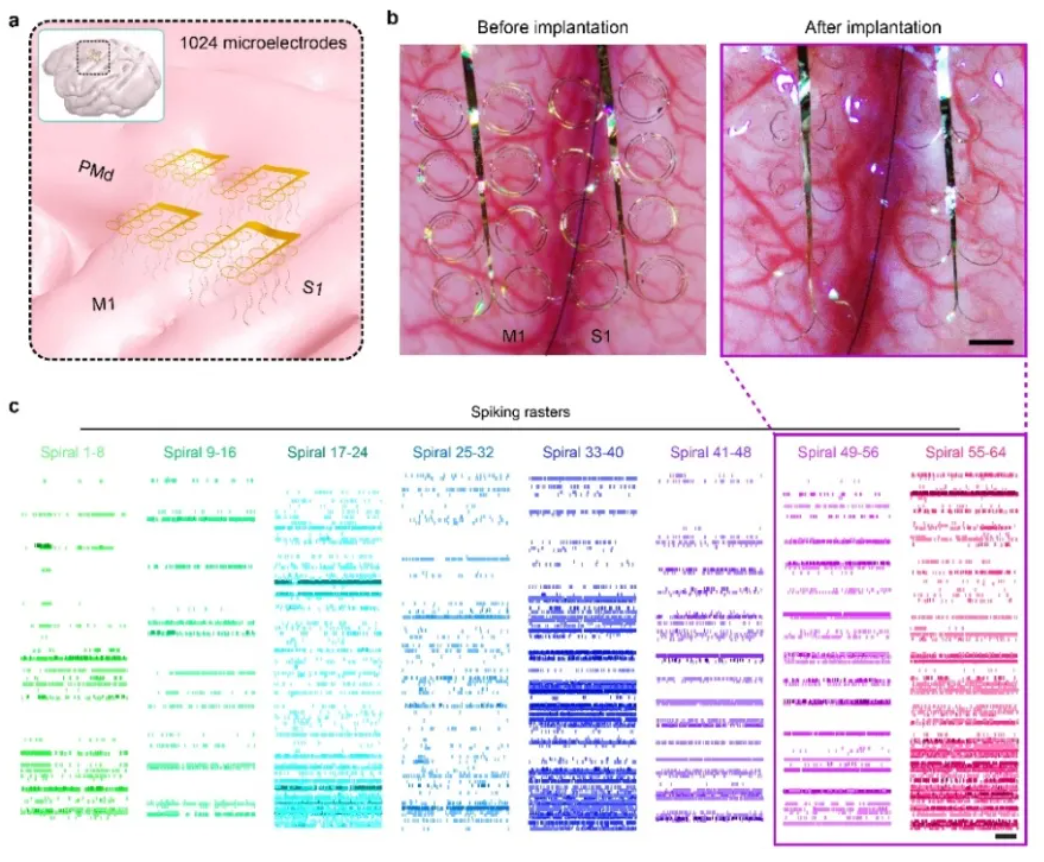 为验证ki-MEAs的长期记录性能,研究团队在猕猴大脑中开展了为期250天的慢性电生理记录。在术后将近一年的时间内,电极始终维持着稳定高质量的神经信号捕获能力:电极植入250天后,256通道阵列单次记录到的神经元数量仍稳定在240个以上。该结果充分证明了ki-MEAs在灵长类大脑中具备高保真度的长期记录能力。在此基础上,研究团队进一步通过多阵列联合植入策略,将ki-MEAs的记录规模扩展至千通量级别,实现了对灵长类跨脑区的大范围测量。电极总覆盖面积超过1cm²,单次神经元记录数量超700个(图4)。通过多电极阵列联合植入,实现了对灵长类大脑跨脑区、千通道的神经信号同步记录,这一结果充分证明了ki-MEAs兼具高通量记录与大范围脑区覆盖的能力。