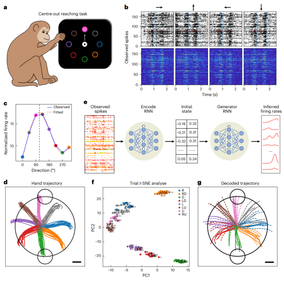 该研究的核心价值不仅在于突破了灵长类大脑神经元大面积,长时程稳定记录的技术瓶颈,还为脑机接口平台的发展提供了技术支持。研究团队利用ki-MEAs记录了猕猴在执行“中心-外展”伸手任务时M1区的神经活动,并结合LFADS模型提取神经放电的潜在动力学特征,进一步采用最优线性估计模型实现了对上肢运动轨迹的精准解码(R²=0.79)。未来,通过整合在线解码框架与功能外设,这种剪纸设计的柔性微电极阵列有望成为理想的临床集神经接口,为瘫痪患者提供更为精准和稳定的功能修复方案,推动脑机接口技术从频繁校准的实验室演示走向真正的临床应用。