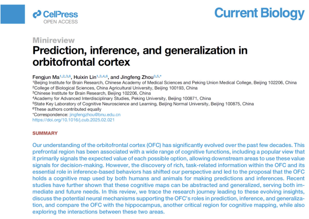北京脑所周景峰实验室综述文章:眶额叶皮层在预测、推理和泛化中的作用 | Current Biology