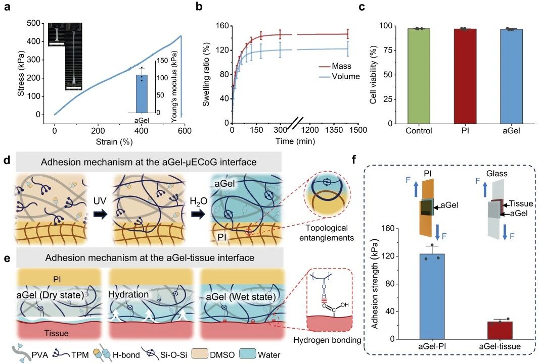 本研究的核心目标是构建一个能与柔软脑组织无缝整合,并可长期稳定记录的高性能神经接口。传统μECoG阵列在力学性能方面与脑组织之间存在明显差异,且缺乏有效粘附,易引发植入后的炎症反应与纤维包裹。为解决上述问题,研究团队使用了一种基于聚乙烯醇(PVA)和聚3-(三甲氧基硅烷)丙基甲基丙烯酸酯(PTPM)的异质网络水凝胶作为关键功能界面层(图1)。该水凝胶具备超软的力学特性(杨氏模量≈109.4 kPa),有效弥合了刚性电极与脑组织之间的模量差距,减轻了机械刺激引起的组织反应。同时,该水凝胶通过干态交联形成的物理氢键机制,可在植入瞬间与湿润脑表面建立牢固粘附(粘附强度≈25.2 kPa),实现无需缝合的稳定固定,并在需要时支持安全、可逆的移除。此外,材料中引入的疏水组分赋予其优异的抗溶胀性能,确保了在湿润生理环境中长期植入的界面结构完整性,避免了因吸水膨胀导致的界面失效(图2)。