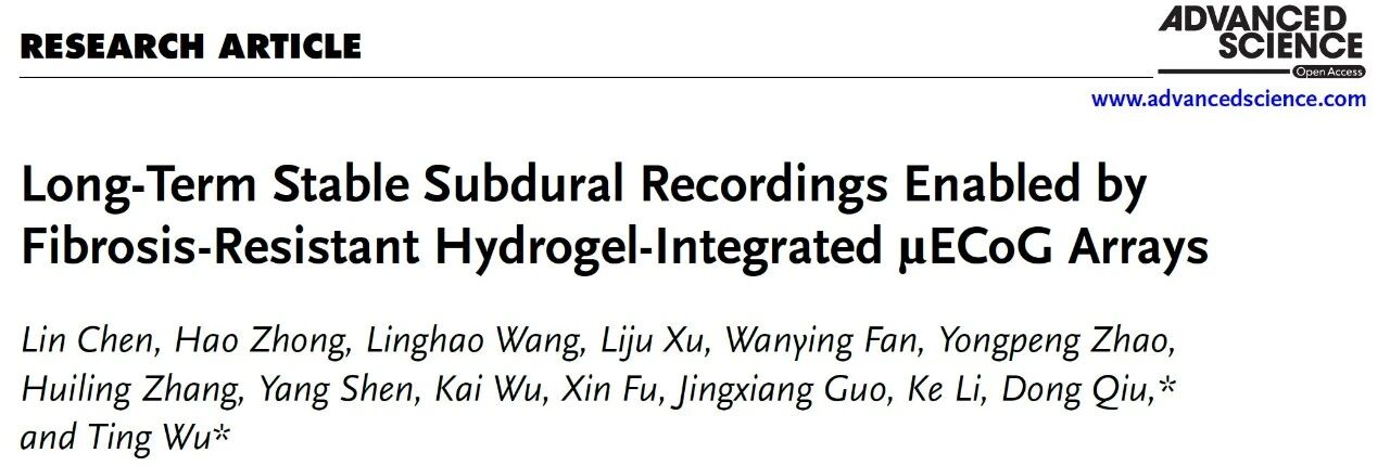 2025年10月8日,北京脑科学与类脑研究所仵婷课题组联合中国科学院化学研究所邱东课题组,在Advanced Science上在线发表了题为“Long-Term Stable Subdural Recordings Enabled by Fibrosis-Resistant Hydrogel-Integrated μECoG Arrays”的研究论文,为解决上述挑战提供了创新型方案。