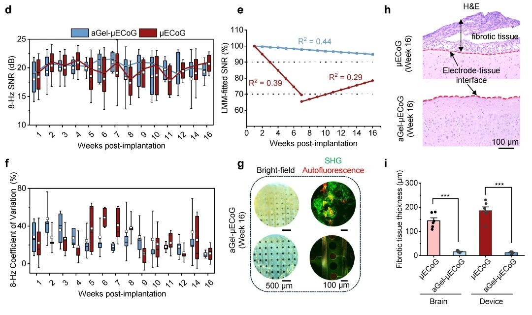 在大鼠模型上进行长达8周的慢性植入验证显示,aGel-μECoG相较无涂层电极显著抑制胶质细胞活化并几乎阻止了纤维囊的形成(图4)。在长达16周的长期电信号记录实验中,aGel-μECoG的界面电化学性能在整个植入期保持高度稳定,急性期阻抗增幅比传统电极低约20倍;这种稳定性直接转化为记录性能的优势,在稳态视觉诱发电位(SSVEP)的长期记录中,aGel-μECoG的信噪比在16周时仍维持初始值的94.8%,而对照组则显著衰减至69.5%(图5)。