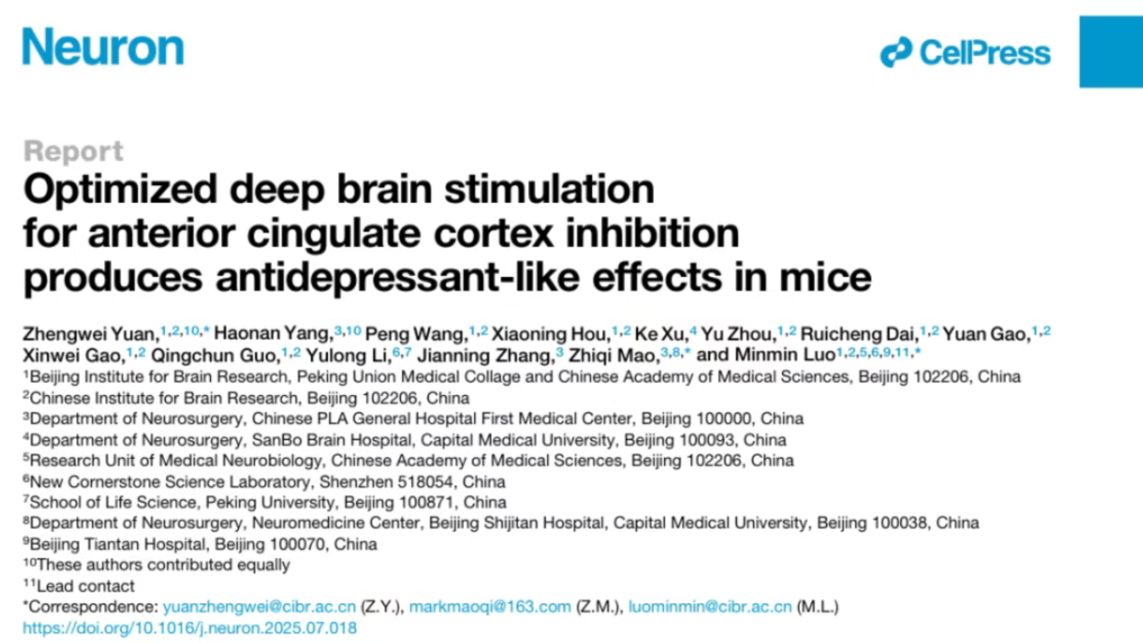 “脑起搏器”新策略!罗敏敏团队精准刺激前扣带回,快速长效缓解抑郁 | Neuron