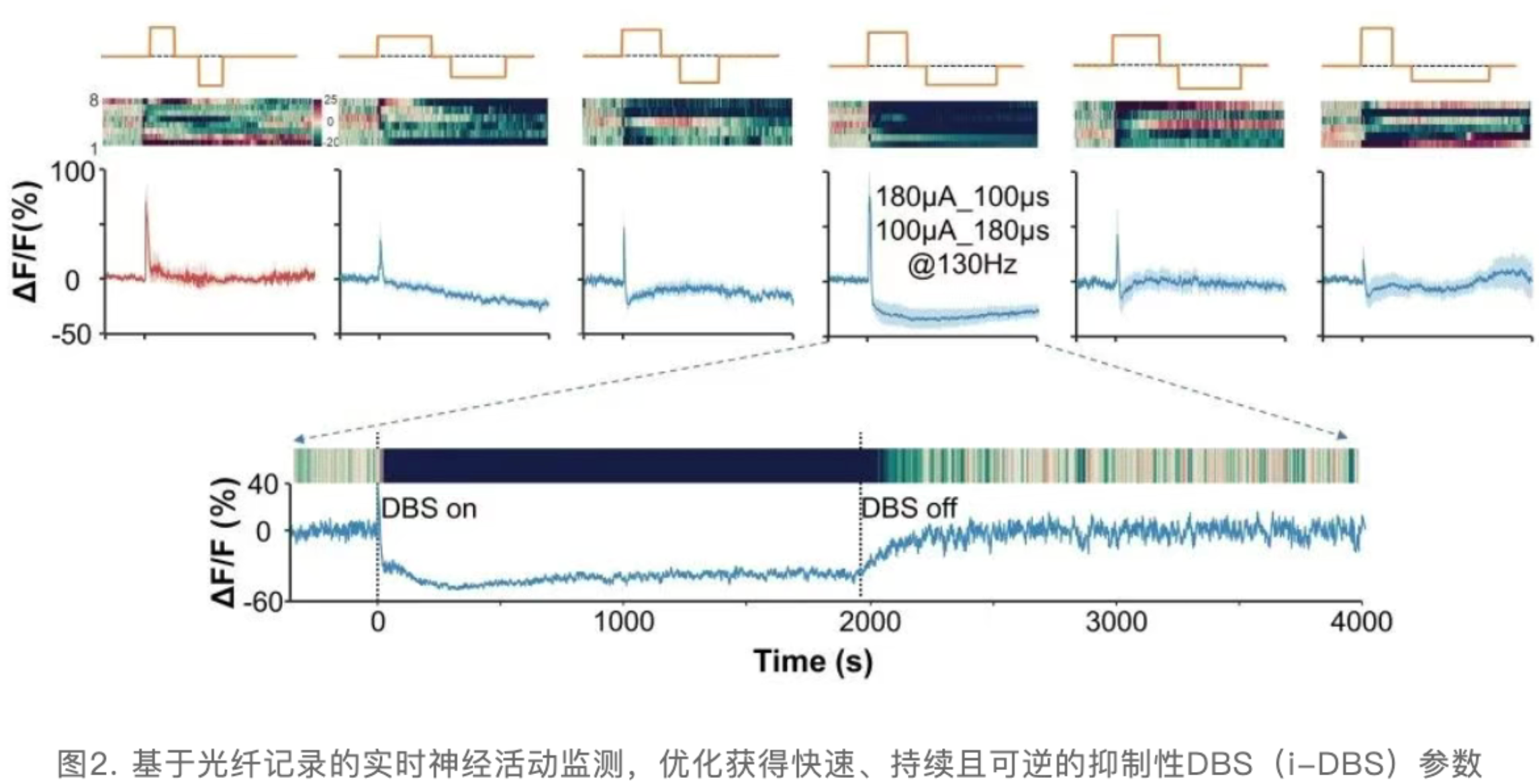 监测结果显示,传统对称双向波并不能有效抑制ACC锥体神经元,这为其缺乏抗抑郁效果提供了直接解释。结合2023年的机制发现——只有有效抑制ACC锥体神经元活动才能发挥抗抑郁作用——团队在细胞类型特异性的实时监控下,不断测试与调整不同波形和参数,最终确定了一组不对称但电荷平衡的双向波,能够快速、强烈且持久地抑制ACC锥体神经元(图2)。团队将其命名为抑制性 DBS(inhibitory DBS, i-DBS)。