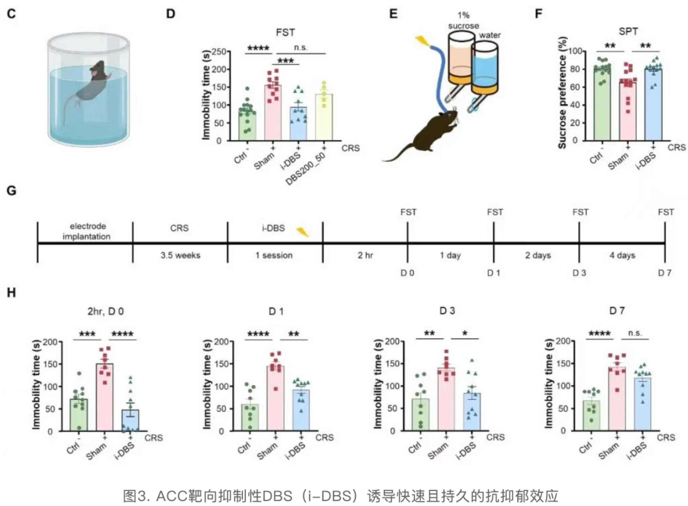 在两种经典抑郁动物模型中,仅需一次约2小时的i-DBS刺激,即可在数小时内迅速改善抑郁样行为,且疗效可持续超过3天,在不同模型中具有良好的可重复性与泛化性(图3)。值得注意的是,在刺激开启期间,各类抑郁样症状均可被显著缓解,表明i-DBS具有快速、实时起效的特点。更进一步,研究发现不同抑郁症状可能由不同神经机制驱动——如快感缺失(anhedonia)需要持续刺激维持改善;而行为绝望(behavioral despair)则对短时i-DBS即有持久响应。这一发现不仅为症状特异性的干预策略提供了理论基础,也提示未来仍需进一步优化参数组合,以实现对更多核心症状的稳定且长期缓解。
