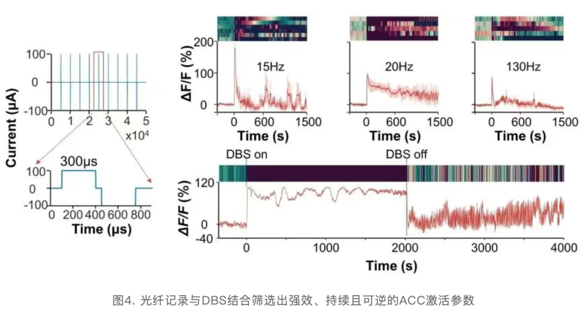 这一现象引发了关键科学问题:传统DBS是否真的像预期一样抑制了ACC活动?为了直接验证,团队克服了技术难题,将DBS与光纤记录技术结合,实现了在刺激的同时监测ACC不同类型神经元的活动。值得强调的是,在本研究中,光与电的结合避免了临床研究中常遇到的电刺激伪迹问题,使得在电刺激期间依然可以清晰记录神经元活动,为刺激参数的实时优化提供了可能。