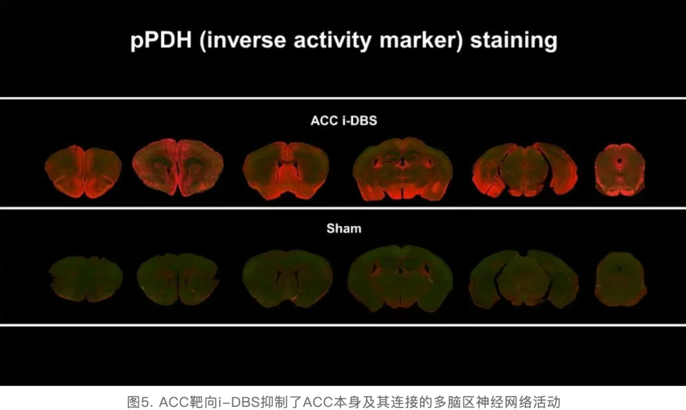 在机制层面,团队首次利用新近鉴定的抑制性标记分子pPDH,追踪i-DBS在全脑范围内的信号转导,发现其可将局部抑制信号扩散至多处情绪相关脑区(杏仁核、外侧隔核及外侧缰核等),从而在神经网络层面实现抗抑郁效果(图5)。这一发现深化了我们对DBS作用机制的理解,为多脑区协同调控策略奠定基础。