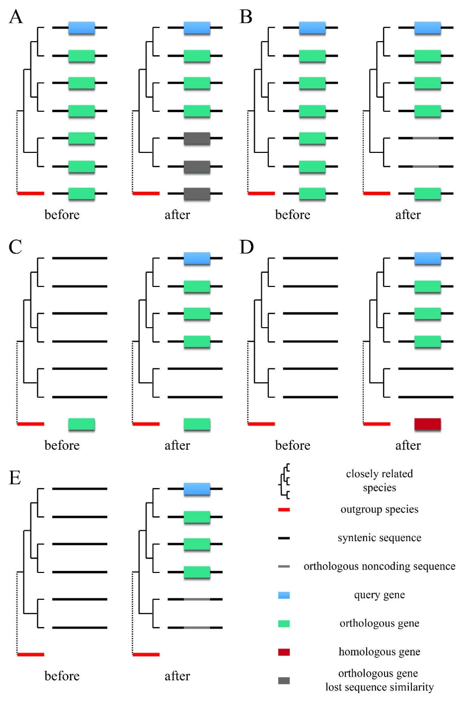 左是原始情况,右是演化后情况。A是序列同源性丢失,B是基因丢失,C是横向转移,D是趋同演化,也是de novo的一种。E是de novo。但是B、C和D在现实中区分不开,所以技术上找的是E。