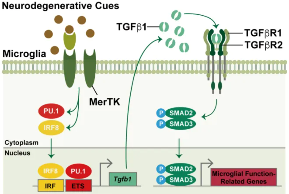 该成果是团队在小胶质细胞功能调控领域继2019年 Protein Cell 研究后的又一重要延伸与突破,不仅填补了小胶质细胞吞噬过程中反向调控自身功能的分子机制空白,还进一步揭示了其响应中枢神经系统退行性疾病的核心信号通路,为后续靶向MerTK-PU.1/IRF8-TGFβ1信号通路的干预策略开发提供了关键理论支撑。