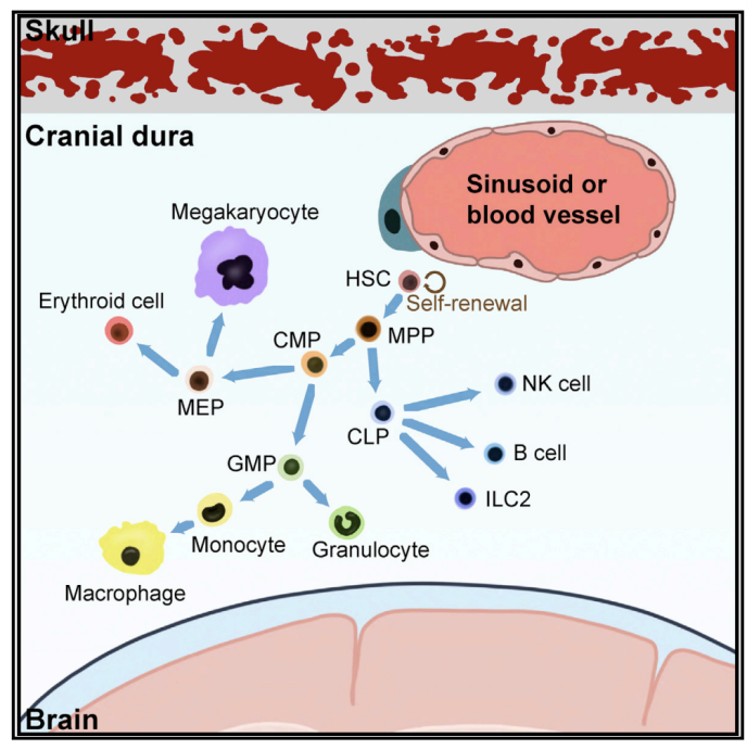 2022年11月8日,张纪岩团队在Cell Reports上在线发表了题为“Identification of hematopoietic stem cells residing in the meninges of adult mice at steady state”的研究论文。该文章通过机械分离硬脑膜白细胞的方法,发现成年小鼠脑膜中存在HSCs,脑膜HSCs具有组织特异性表达谱,可为中枢神经系统提供更适应局部微环境的白细胞,扩充了我们对于生理性髓外造血的认知,也为脑膜免疫细胞的来源提供了一个更为合理的解释。