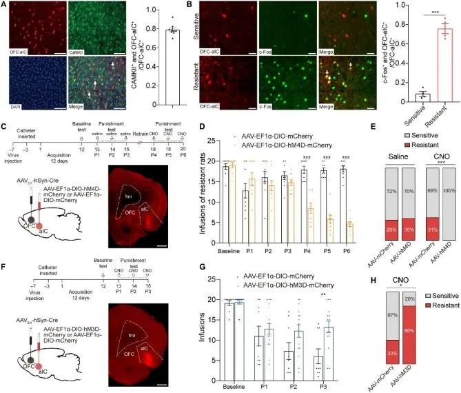 围绕该关键科学问题,研究团队首先对可卡因成瘾大鼠的不同维度的行为学指标进行无监督机器学习,筛选出具有强迫性觅药行为特征的个体。随后,研究人员采用免疫荧光、光纤记录和全细胞膜片钳记录等技术,发现有强迫性觅药行为表型的大鼠存在前岛叶(aIC)及眶额叶-前岛叶(OFC-aIC)神经环路的异常激活。使用化学遗传学手段抑制aIC与OFC-aIC神经环路可以显著抑制大鼠的强迫性觅药行为,而激活aIC与OFC-aIC神经环路则可以诱导强迫性觅药行为。此外,还发现谷氨酸能神经元是aIC与OFC-aIC神经环路双向调控强迫性觅药行为的主要神经元类型。该研究首次揭示了aIC与OFC-aIC神经环路在强迫性觅药行为中发挥重要调控作用,并为药物成瘾防治提供了新的干预靶点。
