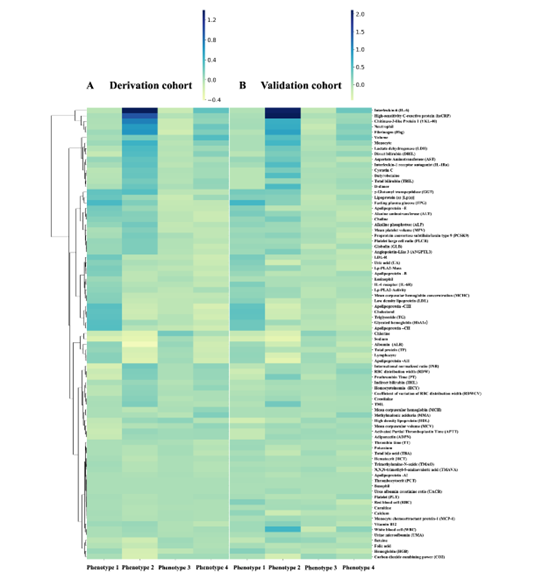 AIS一种复杂的、多因素疾病,人群异质性大,如何发现有效的生物标志物,构建实现疾病预后风险分层、反应疾病病理生理学机制以及治疗反应性的AIS精准表型是实现缺血性卒中精准诊疗亟待解决的关键问题。为回答上述重要临床问题,该研究对AIS患者的92个特征进行分析,采用高斯混合模型(Gaussian Mixture Model, GMM) 进行无监督聚类,获得4个基于不同生物标志物、反映不同病理生理学机制的新表型(Phenotype),可以实现有效的疾病预后风险分层。研究结果发现以炎症、肾功能异常为主要特征的Phenotype 2复发 、死亡以及不良功能结局风险显著高于其他表型,并且对强化他汀的治疗反应性良好。该研究应用机器学习方法在全国性多中心卒中队列中发现可靠的生物标志物,首次探索性地利用生物标志物构建了急性缺血性卒中的精准表型,为未来AIS精准诊疗奠定了基础。