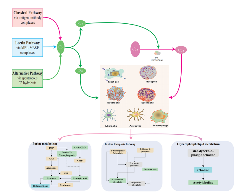 杜蛭丸是被中国药典收录的中成药,用于气虚血瘀型缺血性中风病中经络恢复期,并具有补肾益气活血功效。本研究在大鼠大脑中动脉阻塞模型,进行药效学评价,发现杜蛭丸对脑缺血大鼠有明显的脑保护作用,可显著减少脑梗死面积以及神经功能缺损评分,增加脑血流值,减少炎症因子的表达。整合转录组与代谢组表明,杜蛭丸可干预C3、C5ar1等关键靶标发挥抗脑缺血的作用,从而调控下游炎症反应相关的代谢通路。
