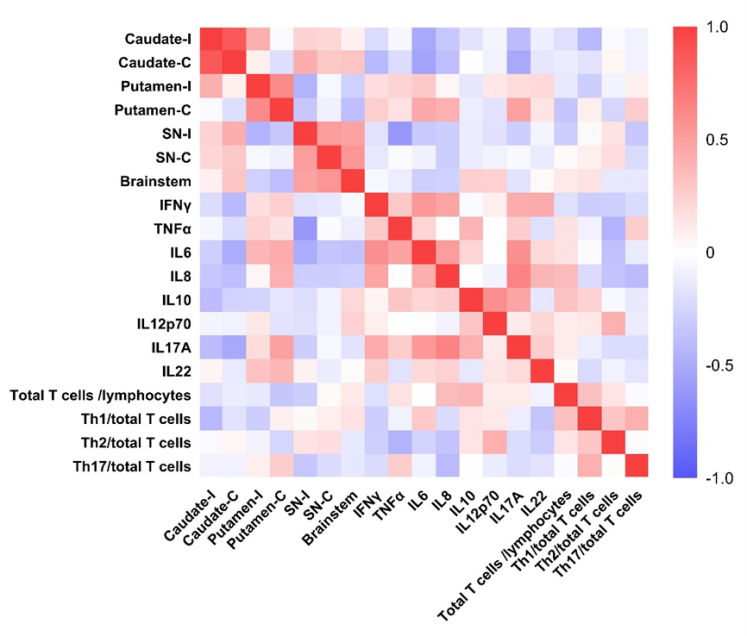 为了研究帕金森病外周血Th细胞相关适应性免疫系统和中枢神经系统退行性变的关系,刘疏影医师和合作者应用分子显像技术评估了脑小胶质细胞激活、多巴胺能神经末梢受损水平,明确早期帕金森病患者存在壳核脑小胶质细胞激活增加、多巴胺能神经元末梢受损;联合流式细胞术和超敏电化学发光技术,可见帕金森病患者外周血Th1细胞比例升高,IL10、IL17A水平升高。但是,患者同一时期外周血Th细胞各亚群比例、细胞因子水平与中枢小胶质细胞激活及多巴胺能神经末梢留存程度间无明显相关。研究证实适应性免疫参与帕金森病的发病过程,但是否与疾病进展相关尚需进一步随访分析。