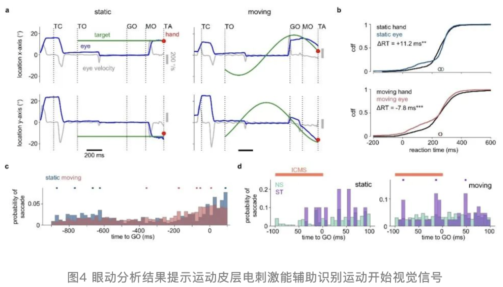 对于动态目标下的运动提前现象,研究者通过眼动数据分析,发现动态目标时,眼动会更早,更经常地追随外周目标的运动,而这会与识别屏幕中心点变暗的“Go”启动信号产生矛盾。与之相对的是,静态任务下,目标出现后眼动往往很快会回到屏幕中心,因此对“Go”信号反应更加迅速。既往许多研究发现,在运动皮层和前运动皮层的电刺激可以指示猕猴进行物体的选择,而初级体感皮层的电刺激能够引起运动皮层相关刺激活动。研究者提出一个可能性,即在电刺激不引起明显运动活动干扰时,在视觉“Go”信号附近出现的电刺激信号也许能作为一个“隐式”的“Go”信号提示猕猴可以伸手,比没接受电刺激时更及时的伸手拦截(图4)。
