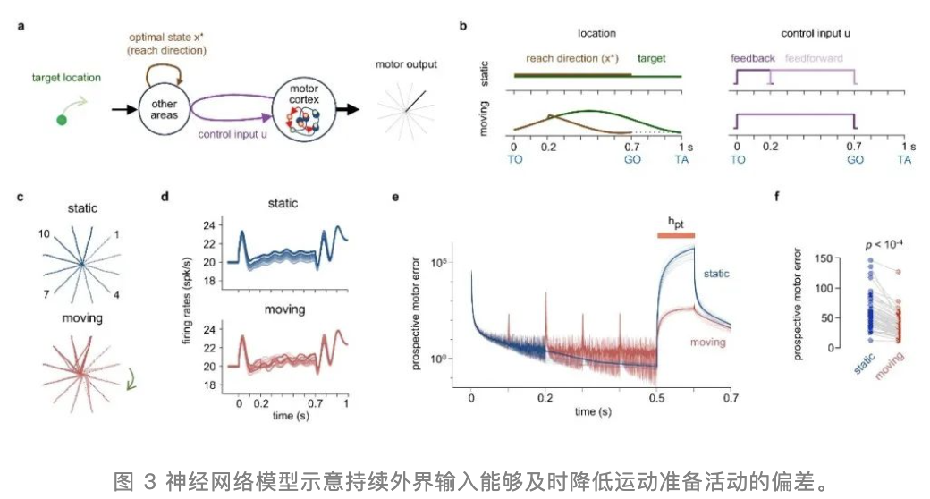 既往研究已经证明运动皮层外其他脑区,尤其是来自下丘脑的动态输入对运动皮层运动生成相关的神经动态有重要贡献,而根据皮层实时状态进行最优反馈控制更新的这种输入,有可能是运动准备快速完成的关键。因此,研究者用一个模型说明了研究者的猜想,即动态目标运动准备过程中,来自其他脑区不断更新的输入能够纠正微刺激带来的干扰,从而不发生运动延迟。而静态目标时,由于缺少这样时时的纠正输入,干扰不能被及时清除,错误不断积累,刺激结束后,错误的清除需要时间,从而造成运动的延迟(图3)。