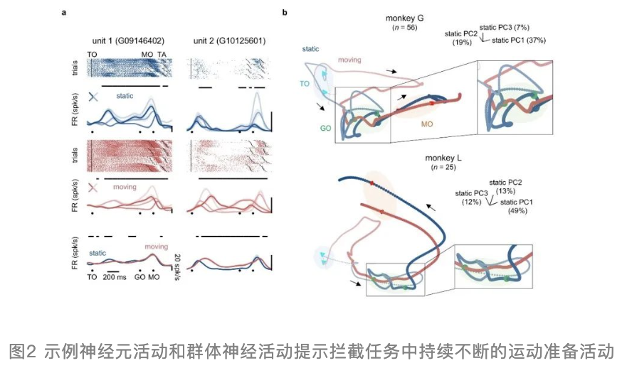 研究者通过不引起肢体运动的阈下微电流刺激干扰猕猴运动皮层的运动准备相关活动。结果发现,静态目标下,猕猴在受到干扰后会发生反应时的增加,即运动启动延迟。但在拦截动态目标时则不会出现运动延迟,反而有时会出现运动提前,但运动准确性没有受到影响。神经群体活动分析显示,猕猴运动皮层神经轨迹在微电流刺激干扰后会偏离正常状态,而在动态目标伸手时,神经轨迹会更快的回到正常态,这与神经轨迹的演化速度相关。神经轨迹演化速度在动态目标下更快,因此,神经活动能更快从偏离的状态回归正常状态,使得运动不发生延迟(图1)。