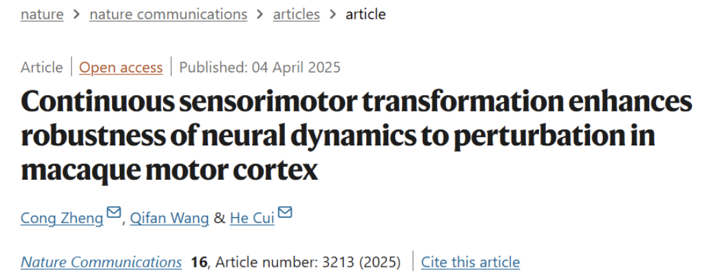 2025年4月4日,北京脑科学与类脑研究所崔翯实验室在Nature Communications发表题为Continuous sensorimotor transformation enhances robustness of neural dynamics to perturbation in macaque motor cortex的研究长文,揭示了灵长类运动皮层在动态环境中抗微电流干扰的鲁棒性机制。