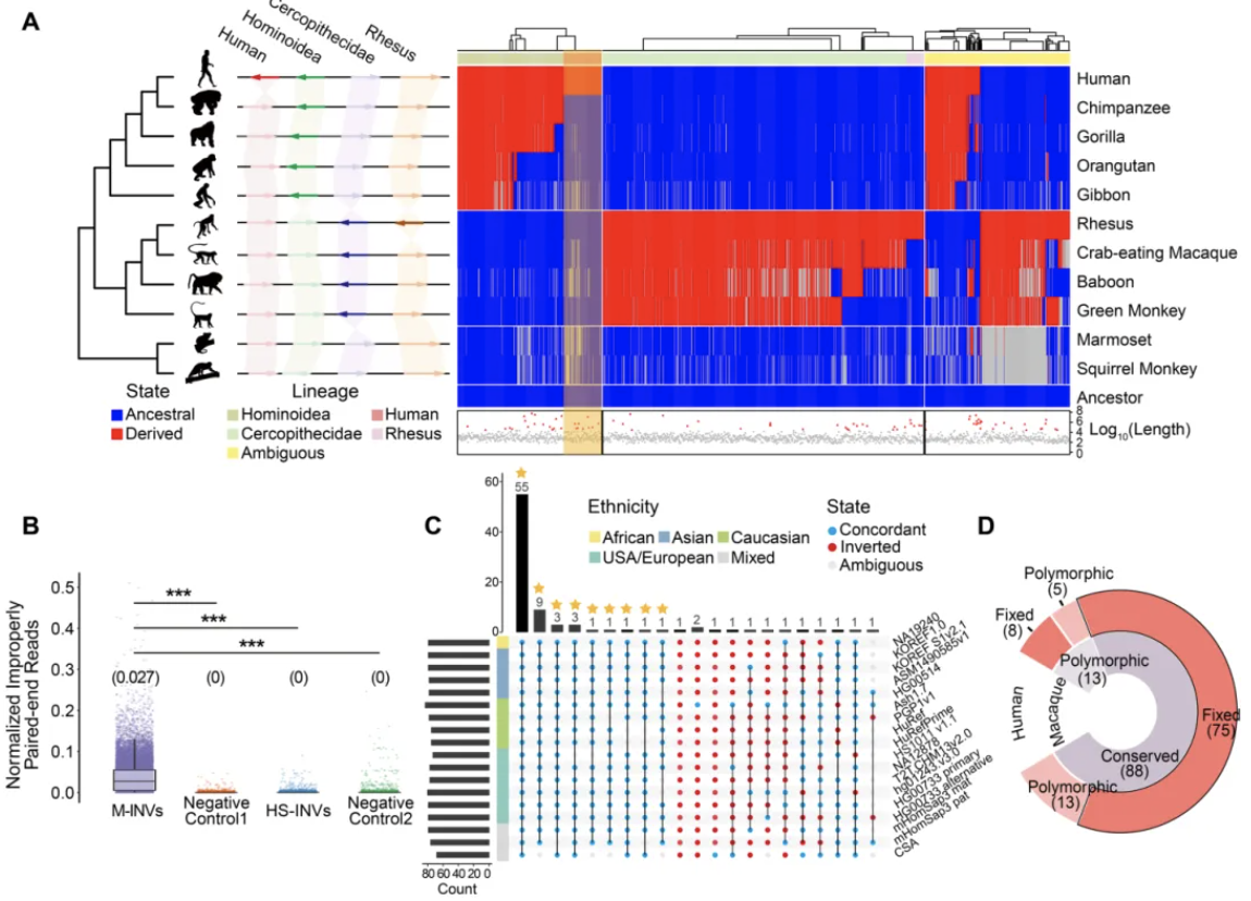 基于上述恒河猴群体SV图谱,研究分别从染色体三维结构、基因结构和变异长度等角度,探究了SV的演化规律,发现长度较长、落在基因或调控区的强效倒位变异事件受到更强的自然选择约束。基于这一发现,研究提出筛选在人类演化中功能性结构变异事件的策略,即在人类起源并固定的强效倒位变异,可能因其适应性功能而被保留,因此这些事件可能编码了人类特有性状。