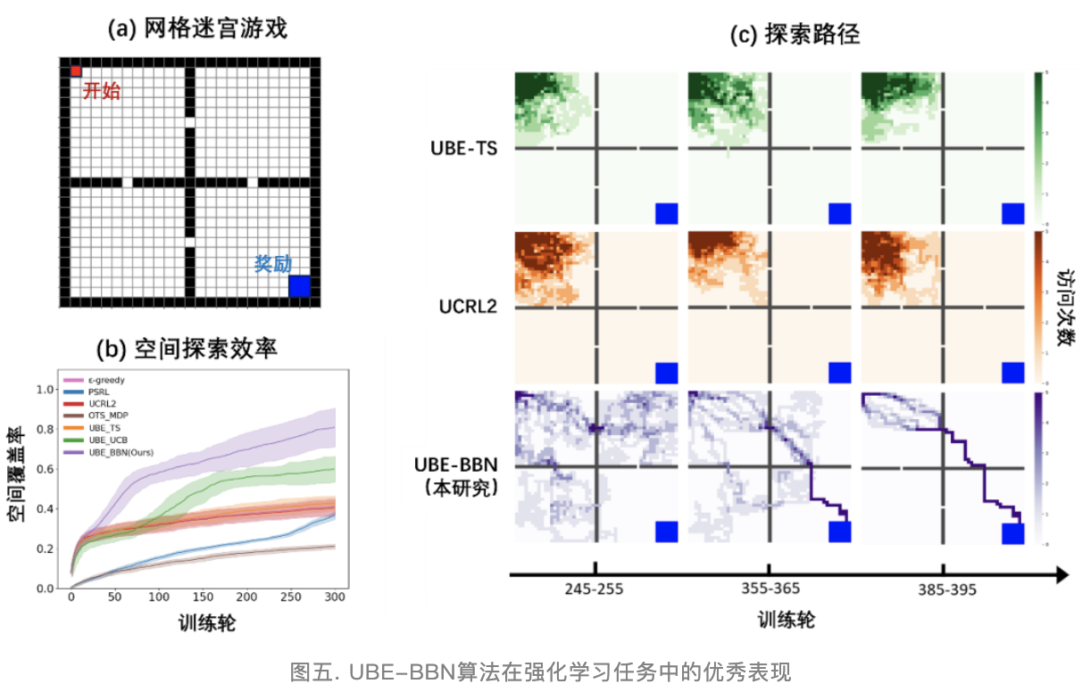 BBN模型在经典的多臂赌博机任务中表现出高效的探索能力,能够根据总不确定性和相对不确定性调整选择概率,表现出类似人类的混合探索策略。同时,BBN在马尔可夫决策过程(MDP)任务中也表现出高效的探索能力,尤其是在稀疏奖励的环境中。通过结合不确定性估计算法Uncertainty Bellman Equation (UBE),BBN能够在复杂的MDP任务中实现高效的探索。在FourRooms任务中(图五),BBN能够快速覆盖整个环境,找到奖励所在区域。与其他算法相比,BBN在探索效率和覆盖速度上具有显著优势。在引入动作持久性后,BBN在大型环境中的探索效率进一步提高。