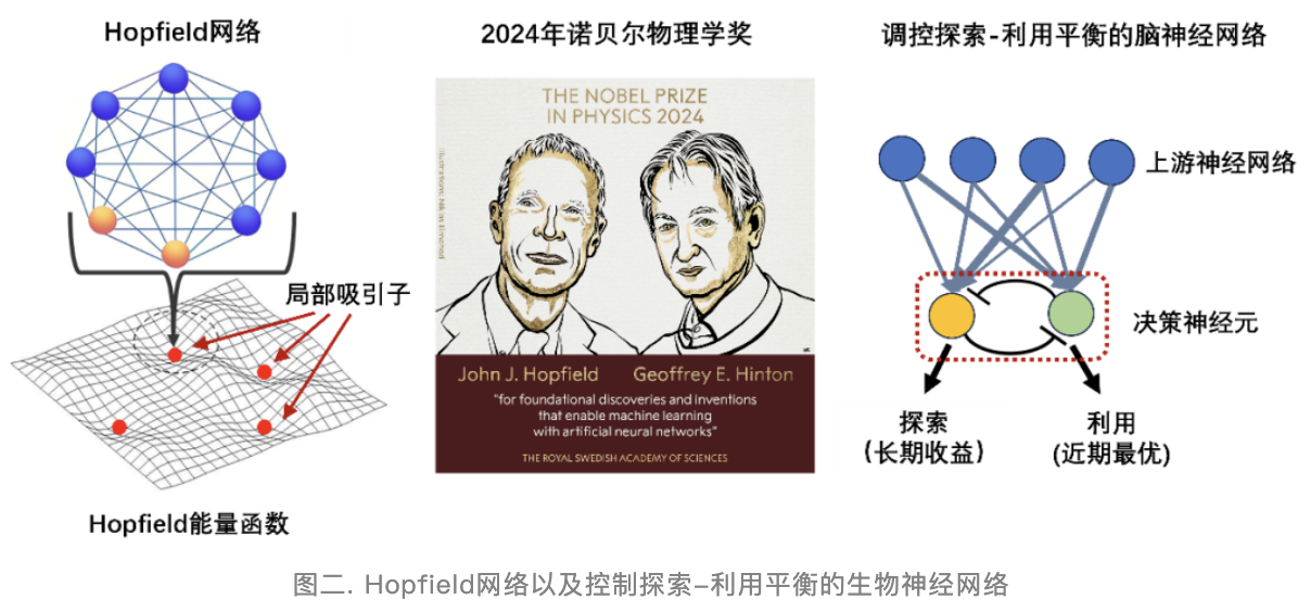 受生物大脑结构的启发,John Hopfield在1982年提出了循环神经网络模型,Hopfield网络。Hopfield网络的主要特点是其对称连接权重和能量函数,这些特性使得网络能够收敛到稳定的状态(称为吸引子)。Hopfield网络在联想记忆和优化问题中有着广泛的应用。受Hopfield网络的启发,“深度学习之父”Geoffrey Hinton在上世纪80年代将随机性引入Hopfield模型,证明了随机性Hopfield网络能够从数据中学习概率分布,并合作提出了能够进行无监督学习的玻尔兹曼机。基于这些成就,Hopfield和Hinton共同获得了2024年的诺贝尔物理学奖。有趣的是,近期脑科学领域在秀丽隐杆线虫中发现了一种具有高效适应性的调控探索-利用的生物神经网络。这一网络的决策单元(图二右,红色虚线框部分)可被认为是一种随机Hopfield网络。