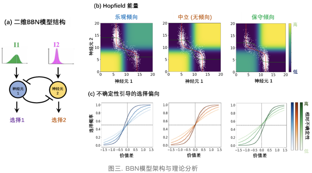 研究首先对调控探索-利用的生物神经网络进行数学建模(以下简称BBN模型)。用一组随机微分方程(Langevin方程)描述每个神经元的实时状态受其他神经元的抑制作用,以及带有随机不确定性的上游输入的影响(图三(a))。理论分析表明,BBN模型的一个重要特性是它能够实现贝叶斯后验采样,即根据输入的信息采样出最可能的网络状态。此外,BBN模型还可以对带有不同程度不确定性的输入信息表现出乐观、中立或保守的选择偏向。这些发现说明BBN模型可以灵活地模拟不确定性状态下的探索行为(图三(b&c))。