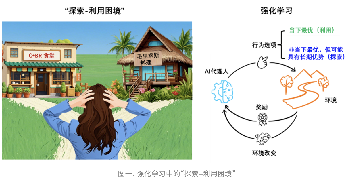 “探索-利用困境”问题最早是在动物觅食行为中提出的,后来在心理学、神经科学和强化学习等领域也变得非常重要(图一左)。探索指的是探索未知的状态和动作,以发现更优的策略;而利用则是根据已有知识做出最优决策。在强化学习领域中,探索与利用的平衡至关重要(图一右)。过多的探索可能导致算法在未知领域浪费过多时间,而过多的利用则容易使算法陷入局部最优解而无法找到全局最优解。