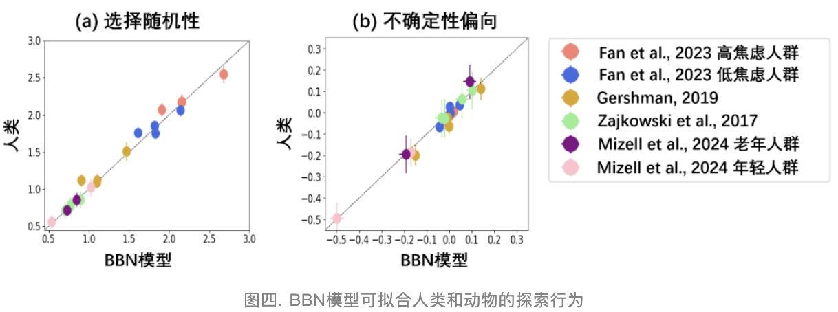 BBN能够拟合人类和动物在探索任务中的行为模式,这表明它可以用于研究心理学中的探索-利用决策机制。例如,BBN可以用于分析不同人群(如焦虑症患者或老年人)在探索任务中的行为差异,从而为心理学研究提供定量化的工具。