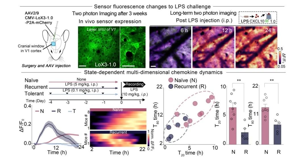 基于LoX3-1.0在体外表现出的优异性能,研究者进一步应用LoX3-1.0解析不同免疫状态下脑内CXCL10的动态变化。持续低剂量或预先高剂量的LPS刺激可促使脑内免疫状态进入特定的“耐受”或“增强”状态,而不同状态会对后续面临相同刺激表现出截然不同的应答模式。与初次(Naïve)接受LPS处理后LoX3-1.0信号的启动延迟、强度适中的反应模式相比,复发组(Recurrent)在接受高剂量LPS二次刺激后,信号启动显著提前,响应更强烈,但在约12小时后迅速衰减,持续时间较短。而耐受组(Tolerant)在接受高剂量LPS刺激后几乎未发生明显信号上升。这些结果表明,LoX3-1.0能够在活体内捕捉与免疫状态匹配的CXCL10的多维动态特征。
