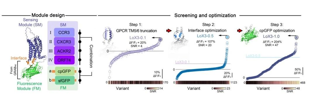 研究者基于GRAB探针的模块化原理11,构建了识别配体的感知模块和荧光报告模块,并从多种天然和病毒来源的CXCL10受体中筛选出CXCR3与构象敏感荧光蛋白cpGFP的组合,作为初始骨架。通过在跨膜区、界面以及荧光蛋白内部关键位点的迭代筛选,获得了对CXCR3激动剂产生约200%响应幅度的探针LoX3-1.0。