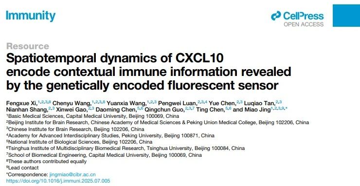 2025年8月15日,北京脑科学与类脑研究所井淼实验室在Immunity杂志发表题为“Spatiotemporal dynamics of CXCL10 encode contextual immune information revealed by the genetically encoded fluorescent sensor”的研究论文,突破现有技术瓶颈,设计并开发新型基因编码的,基于G蛋白偶联受体激活(GRAB)原理的荧光探针GRAB-LoX3-1.0,在活体动物中实现了趋化因子CXCL10的高分辨率追踪,并揭示了不同免疫状态下CXCL10通过“时空编码”传递环境信息的潜在原理。该研究为深入解析趋化因子的复杂功能提供了有力工具和理论支持。
